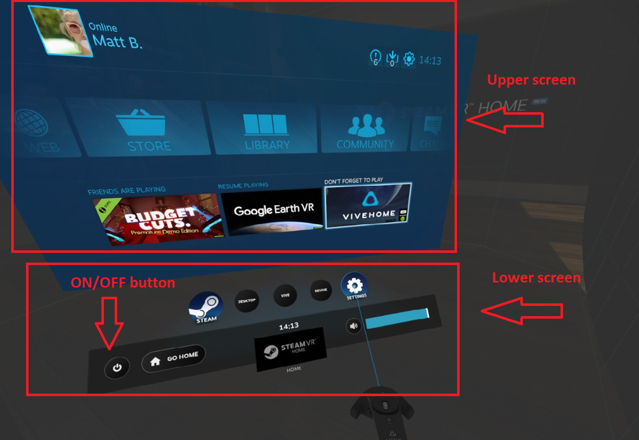 1. Press long BACK button. On the Headset you will see the steam icon and a green circle filling up around it. When it is filled it is opening the Steam VR Dashboard