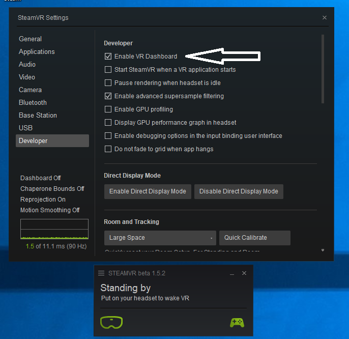 First make sure you have the Steam VR Dashboard enabled in Steam VR settings: