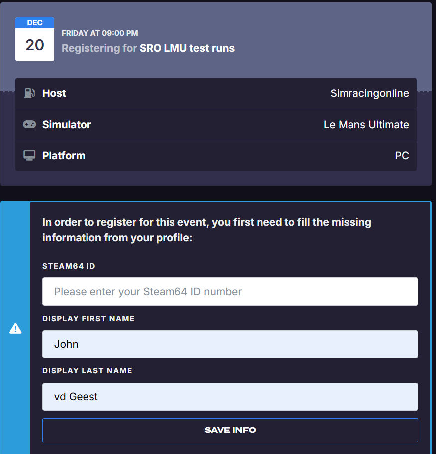 We are looking at a possible test run Friday Dec 20th @ 20:00 GMT using non DLC GTE & LMP2 @ Sebring .. check out simracingonline SimGrid Sim Grid is not mandatory while we test things out but please check it out and register if you can make it! the server will be in the hosted section of LMU MP using our default PW you will also have the PW from SimGrid If you register their.. We need to edit our database on the site before we can have registration for LMU here as of now it's WIP.