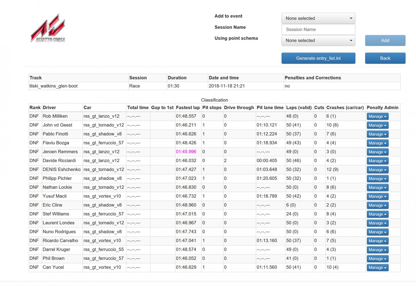 We have an issue with the result file ..meaning the server did not create one .. we have quall but that's it , I can see that stracker has the info but its hosed as well showing DNF for all ..I have a message into rack service as this is 2 weeks in a row for this server having issues . anyone have a shot of the in game results ?