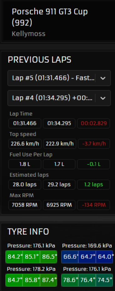 2.png I am lower 1:30's, I figure 85 litres will do it for me. I added one click for more downforce. I was able to get more speed going into Apex.